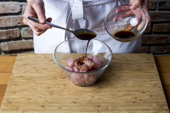 Die Hähnchenbrust in 1cm große Würfel schneiden und mit der Teriyakisoße marinieren. In einem mittleren Topf ausreichend gesalzenes Wasser für die Reisbandnudeln zum Kochen bringen.