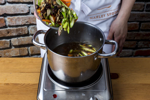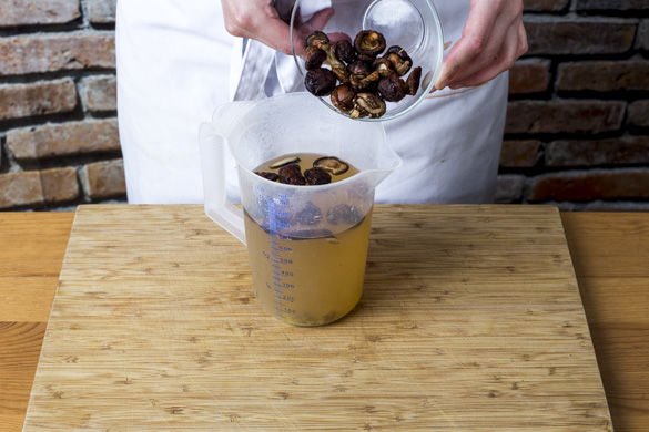Inzwischen 700ml Wasser im Wasserkocher aufkochen und den Brühwürfel darin auflösen. Anschließend die Shiitakepilze in der Brühe für ca. 8-10Min. einweichen lassen. Die Pilze im Anschluss ggfs. nochmal in kleinere Streifen schneiden.