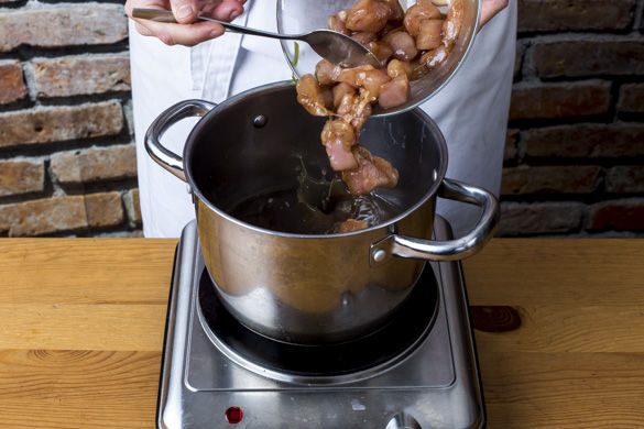 Die Brühe mit Pilzen in einem großen Kochtopf nochmals aufkochen lassen, dann das Hähnchen mit der Teriyakisauce und Sojasauce hinzugeben. Das Fleisch bei geringer Hitze ca. 5-8Min. ziehen lassen.