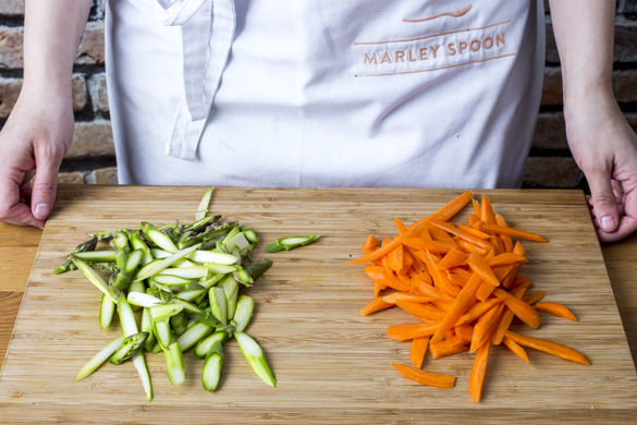 Nun das letzte Drittel des Spargels mit einem Sparschäler abschälen und den Spargel gut waschen, dann in dünne, schräge Streifen schneiden. Die Karotte ebenfalls schälen, der Länge nach halbieren und in dünne, schräge Streifen schneiden.