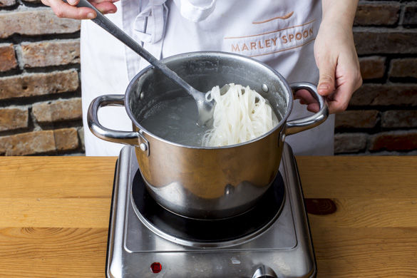 Sobald das Wasser kocht, die Reisbandnudeln ca. 6-8Min. auf niedriger Hitze köcheln lassen, dann durch ein Sieb abgießen und mit kaltem Wasser abschrecken.
