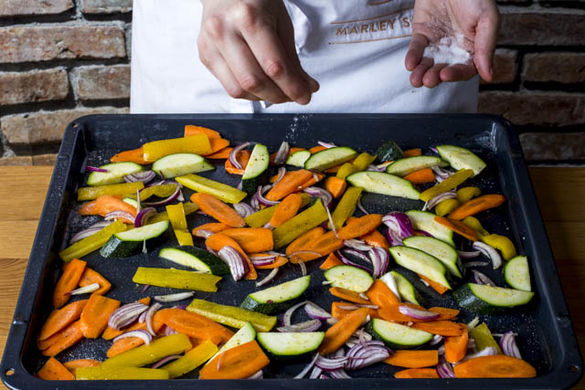 Das Gemüse auf ein Backblech geben, mit 1EL Olivenöl, Salz, Pfeffer und 1 Prise Zucker mischen und für ca. 20–25Min. im Ofen garen.