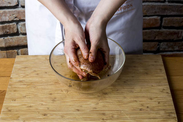 Inzwischen 300ml Wasser in einem Wasserkocher aufkochen. Den Couscous in einer Schüssel mit der 1/2 der Gewürzmischung, Salz und Pfeffer sowie 1–2EL Olivenöl und Essig mischen und anschließend mit dem heißen Wasser übergießen. Abgedeckt ca. 8–10Min. ziehen lassen.