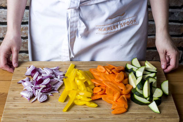 Den Backofen auf 220°C Umluft (240°C Ober-/Unterhitze) vorheizen. Die Paprika vierteln, entkernen und in 1–2cm breite Streifen schneiden. Die Zwiebel schälen, halbieren und in feine Halbringe schneiden. Die Karotten schälen und schräg in dünne Scheiben schneiden. Die Zucchini längs halbieren und schräg in ca. 1cm dicke Scheiben schneiden.
