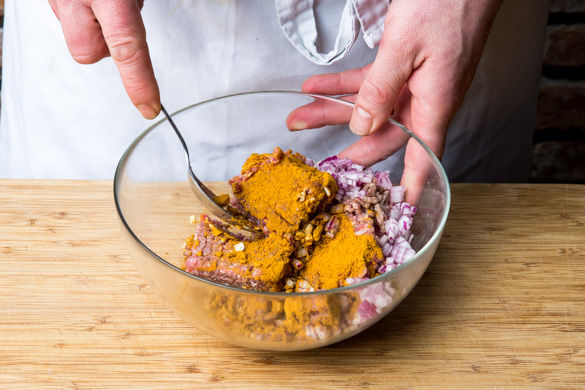 Die Zwiebel- und Knoblauchwürfel mit dem Currygewürz und Hackfleisch vermengen und mit 1/2 TL Salz und Pfeffer abschmecken.