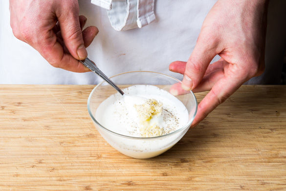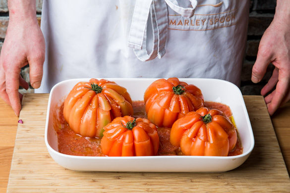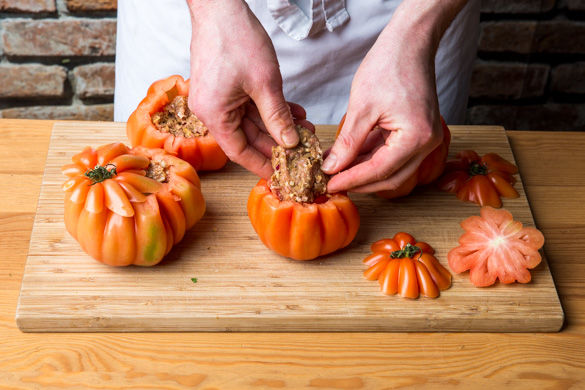 Am Strunkstück der Tomate ca. 1cm breit einen Deckel zum Füllen abschneiden. Mit einem kleinen Löffel die Tomate vorsichtig aushöhlen, dabei die Tomatenkerne für später aufheben, und mit der Hackmasse füllen. Den Deckel zum Schluss wieder darauf drücken.