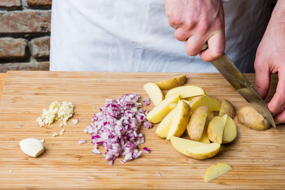 Den Backofen auf 200°C Umluft vorheizen. Die Zwiebel schälen, halbieren und in feine Würfel schneiden. Den Knoblauch ebenfalls schälen und eine Zehe in feine Würfel schneiden, die zweite für später zur Seite legen. Die Kartoffeln vierteln, je nach Größe ggfs. achteln.