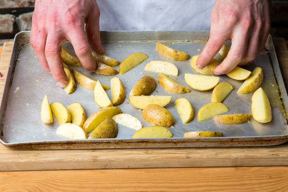 Nun die Kartoffelschnitten auf dem Backblech verteilen, mit 1-2EL Olivenöl und etwas Salz mischen und ebenfalls für ca. 20-25Min. im Ofen rösten, bis sie goldbraun und knusprig sind.