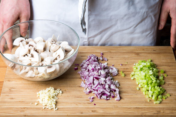 Die Pilze mit etwas Küchenkrepp oder einer Bürste von evtl. Schmutz befreien und je nach Größe vierteln oder achteln. Den Stangensellerie längs halbieren und in feine Würfel schneiden. Die Schalotten und den Knoblauch schälen und fein würfeln.