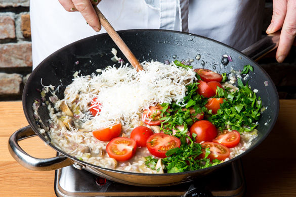 Wenn das Leben dir unreife Trauben gibt, mach doch Verjus daraus! Der gepresste Saft gibt Gerichten wie Zitronensaft oder Essig eine saure Note, hat aber im Vergleich zu Essig doch ein süßeres, sanftes Aroma. Verjus wird eine beruhigende Wirkung auf Magen und Verdauung nachgesagt. In diesem Risotto kommt alles lecker-schmackhaft mit saftigen Kirschtomaten, Selleriewürfeln und Pilzen zusammen.
