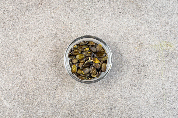 In einem Wasserkocher 700ml Wasser zum Kochen bringen. Den Knoblauch schälen und fein würfeln. Die Kürbiskerne in einem mittelgroßen Topf ohne Zugabe von Fett bei mittlerer Hitze 2–4Min. anrösten, bis sie knistern und goldbraun sind. Zum Abkühlen aus dem Topf nehmen.