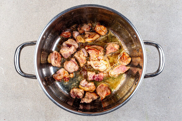 Das Fleisch trocken tupfen, in 2–3cm große Stücke schneiden und mit je 1 kräftigen Prise Salz und Pfeffer würzen. Das Fleisch in demselben Topf mit 1EL Butter bei starker Hitze in 1–2Min. goldbraun anbraten.