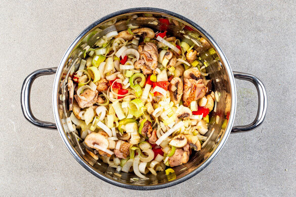 Heute zauberst du einen Schmaus für die ganze Familie, und zwar aus nur einem Topf! Das zarte Hähnchenschenkelfilet schmurgelt zusammen mit bereits vorgeschnittenem Lauch, Paprika und Pilzen, dann kommen die hübsch gerollten Casarecce hinzu. Während die Pasta kocht, bereitest du aus grünen Oliven, angerösteten Kürbiskernen und einem Hauch von Zitrone ein leckeres Topping zu – und der Rest ist Kochgeschichte ...
