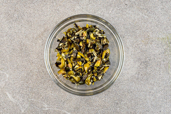Die Oliven und die Kürbiskerne grob hacken. 1TL Zitronenschale abreiben, dann die Zitrone halbieren und auspressen. Die Oliven, die Kürbiskerne und die Zitronenschale mit 1–2EL Zitronensaft und je 1 Prise Salz und Pfeffer vermengen.