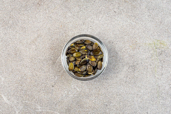 In einem Wasserkocher 1,4L Wasser zum Kochen bringen. Den Knoblauch schälen und fein würfeln. Die Kürbiskerne in einem großen Topf ohne Zugabe von Fett bei mittlerer Hitze 2–4Min. anrösten, bis sie knistern und goldbraun sind. Zum Abkühlen aus dem Topf nehmen.