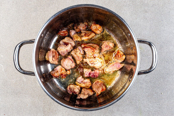 Das Fleisch trocken tupfen, in 2–3cm große Stücke schneiden und mit je 1 kräftigen Prise Salz und Pfeffer würzen. Das Fleisch in demselben Topf mit 2EL Butter bei starker Hitze in 1–2Min. goldbraun anbraten.