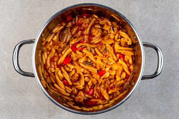 Das Tomatenmark und die Gewürzmischung in den Topf rühren und ca. 1Min. erwärmen. Dann die Pasta hinzugeben und mit dem kochenden Wasser bedecken. Die 1/2 des Brühgewürzes einrühren und die Pasta in 12–14Min. bissfest kochen, dabei regelmäßig umrühren. Ggf. mehr Wasser hinzufügen, falls die Sauce zu dickflüssig ist.