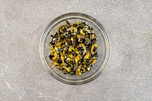 Die Oliven und die Kürbiskerne grob hacken. 2TL Zitronenschale abreiben, dann die Zitronen halbieren und auspressen. Die Oliven, die Kürbiskerne und die Zitronenschale mit 2–3EL Zitronensaft und je 1 Prise Salz und Pfeffer vermengen.
