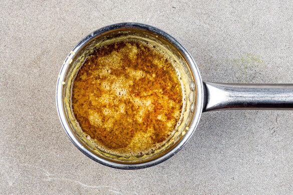 Den Backofen auf 240°C (220°C Umluft) vorheizen. Den Knoblauch schälen und sehr fein würfeln oder durch eine Knoblauchpresse drücken. 50g Butter in einem kleinen Topf bei niedriger Hitze schmelzen, dann den Knoblauch hinzufügen und 1–2Min. goldbraun anbraten. Mit je 1 Prise Salz und Pfeffer würzen und beiseitestellen.