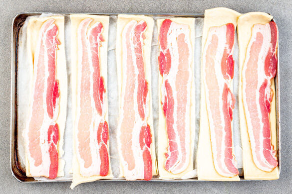 Den Teig ausrollen, das Papier abziehen und auf ein Backblech legen. Den Teig quer in 6 gleich große Streifen schneiden. Tipp: Den Teig am besten zuerst quer halbieren und dann beide Hälften in 3 Streifen schneiden. Auf jeden Streifen 1 Baconscheibe legen.