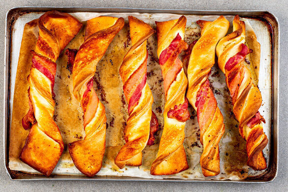 Die Teige ausrollen, das Papier abziehen und auf je ein Backblech legen. Die Teige quer in je 6 gleich große Streifen schneiden. Tipp: Die Teige am besten zuerst quer halbieren und dann beide Hälften in 3 Streifen schneiden. Auf jeden Streifen 1 Baconscheibe legen.