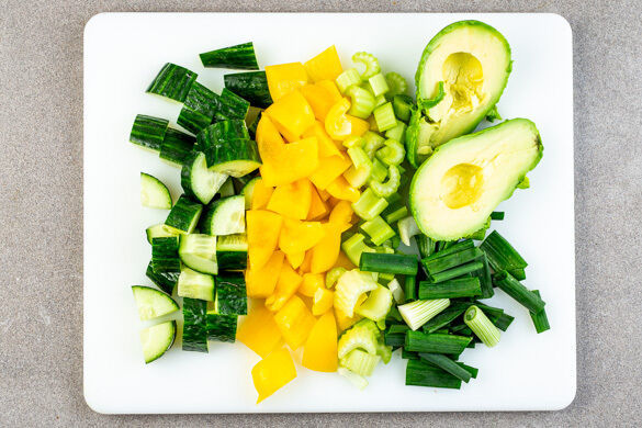 Die Paprika vierteln, entkernen und grob würfeln. Die Gurke und den Sellerie ebenfalls grob würfeln. Die Lauchzwiebeln in grobe Stücke schneiden. Die Avocados halbieren, die Kerne entfernen und das Fruchtfleisch mit einem Löffel aus der Schale lösen.