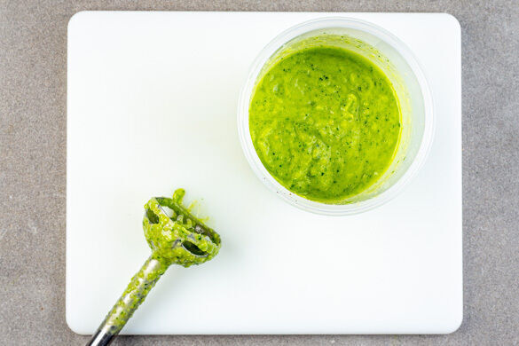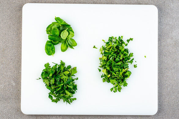 Die 1/2 der Basilikum- und Petersilienblätter für die Garnitur abzupfen und beiseitelegen, dann die restlichen Kräuter samt Stängeln grob schneiden.