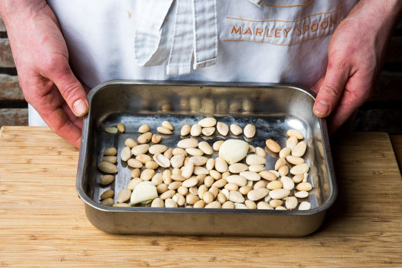 Nun den Knoblauch schälen und mit Mandeln in einer kleinen Auflaufform für ca. 5-8Min. im Ofen mitrösten.
