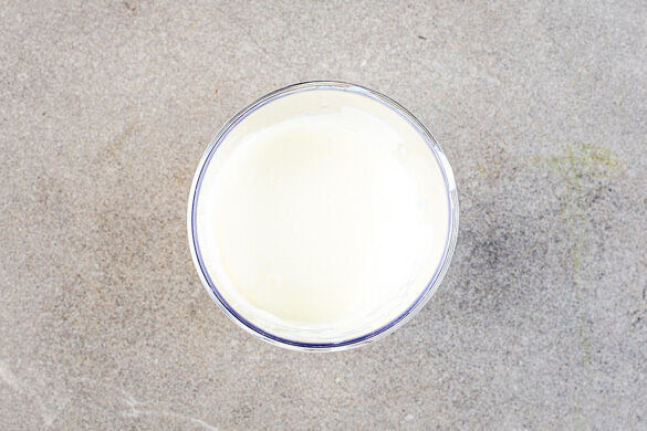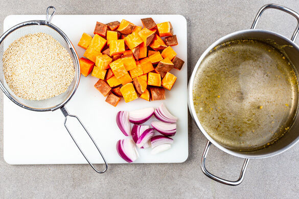 Den Backofen auf 240°C (220°C Umluft) vorheizen. Die Quinoa in einem feinmaschigen Sieb warm abspülen. In einem kleinen Topf 350ml Wasser mit der 1/2 des Brühgewürzes aufkochen. Die Süßkartoffel samt Schale in ca. 2cm große Würfel schneiden. Die Zwiebel schälen, halbieren und jede Hälfte in 4 Spalten schneiden.