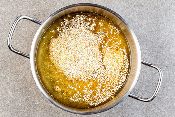 Die Quinoa in die kochende Brühe geben und 10–12Min. abgedeckt bei niedriger bis mittlerer Hitze sanft köcheln lassen. Vom Herd nehmen und bis zum Servieren warm halten.