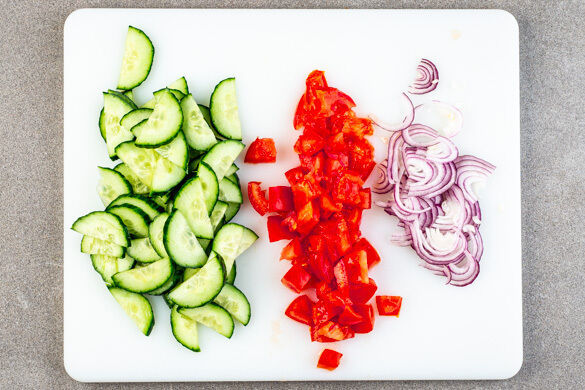 Die Tomate grob würfeln. Die Gurke längs halbieren und in dünne Scheiben schneiden. Die Zwiebel schälen und halbieren, eine Hälfte in feine Streifen schneiden, die andere Hälfte grob würfeln. Die Tomaten, die Gurken und die Zwiebelstreifen mit dem Dressing vermengen und bis zum Servieren im Kühlschrank aufbewahren.