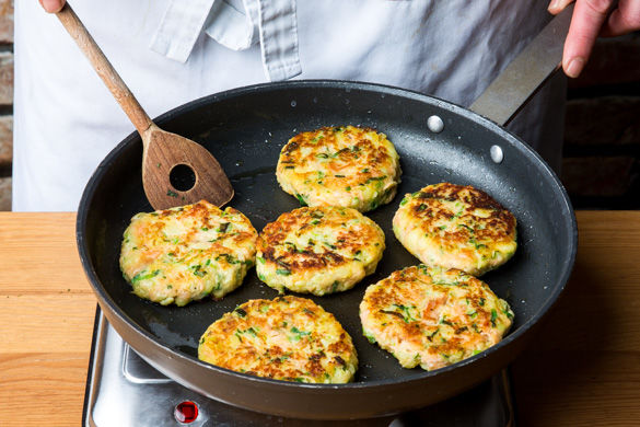Die Kartoffeln zu einem Püree stampfen und mit den Lauchzwiebelringen, dem restlichen Panko, 2–3EL Weizenmehl und dem Lachs vermischen. Mit einem verquirlten Ei gründlich verkneten und gut mit Salz und Pfeffer abschmecken. Falls die Masse zu klebrig ist, nach Bedarf etwas mehr Mehl hinzufügen. Mit angefeuchteten Händen ca. 6–7 flache Küchlein formen.
