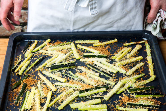 Die Zucchinistifte für ca. 10–12Min. im Ofen rösten, bis sie knusprig sind