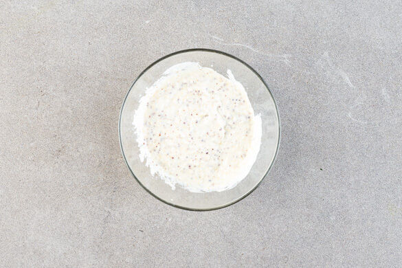 Die Meerrettichwurzel schälen und fein reiben. 2/3 des Joghurts und 3/4 des Meerrettichs mit 1EL Senf, 1EL Pflanzenöl, 1TL Essig, 1/2TL Salz und je 1 Prise Pfeffer und Zucker zu einem Dressing verrühren.