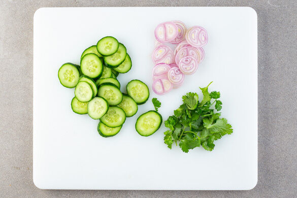 Die Gurke in dünne Scheiben schneiden. Die Schalotten schälen und in feine Ringe schneiden. Den Koriander samt Stängeln grob schneiden.
