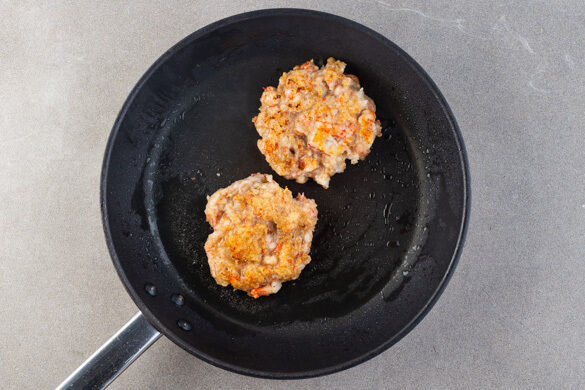 In einer großen Pfanne 1EL Pflanzenöl stark erhitzen. Die Garnelenmasse in 2 gleich großen Haufen in das heiße Öl geben und mit einem Löffel oder Spatel sofort flach drücken. Die Pattys auf jeder Seite 3–4Min. braten. Falls die Pattys zu schnell dunkel werden, die Hitze reduzieren.