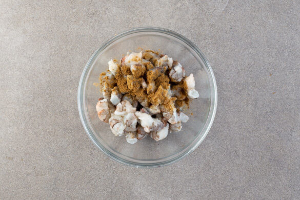 Die Limette halbieren und eine Hälfte auspressen, die andere Hälfte in Spalten schneiden. Die Garnelen kalt abspülen, trocken tupfen und in einem hohen Gefäß mit 1TL Limettensaft, der 1/2 der Tandoori-Gewürzmischung, 1TL Backpulver, 1EL Mehl und 1 Prise Salz grob pürieren. Die Burgerbrötchen ca. 3Min. auf einem Rost unter dem Gemüse im Ofen erwärmen.