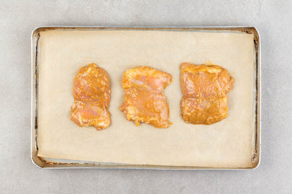 Das Backblech nach ca. 15Min. aus dem Ofen nehmen, das Fleisch wenden und mit der restlichen Fleischmarinade aus Schritt 3 bestreichen. Im Ofen weitere 5–10Min. backen, bis das Fleisch gar und appetitlich gebräunt ist.