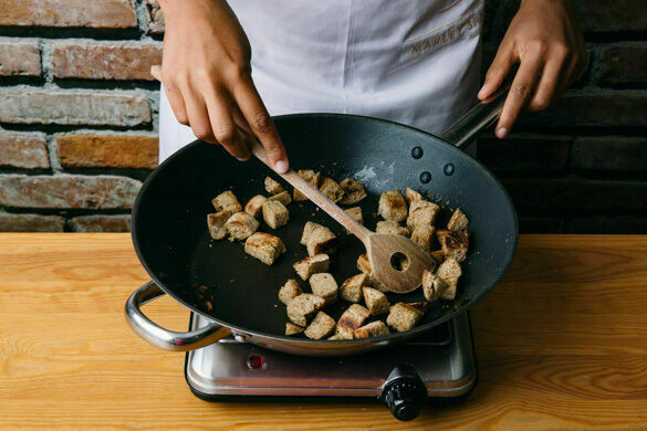 Die Brötchen in ca. 2cm große Stücke schneiden. In der Pfanne 2EL Olivenöl bei starker Hitze erwärmen. Die Brotstücke in das heiße Öl geben und gut umrühren, um das Öl gleichmäßig auf die Brotstücke zu verteilen. Die Hitze leicht reduzieren und die Brotstücke in ca. 5Min. knusprig braten. Aus der Pfanne nehmen und die Croûtons mit je 1 Prise Salz und Pfeffer bestreuen.