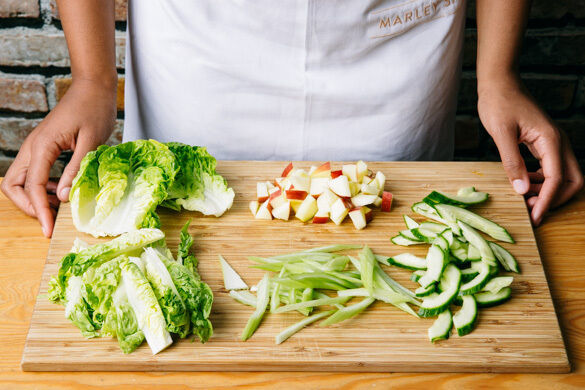 Den Apfel vierteln, entkernen und in kleine Würfel schneiden. Die äußeren Blätter des Romanasalats ablösen und beiseitelegen, den übrigen Salat in dünne Streifen schneiden. Den Sellerie schräg in sehr feine Streifen schneiden. Die Gurke längs halbieren, die Kerne mit einem Löffel entfernen und die Gurke leicht schräg in dünne Scheiben schneiden.