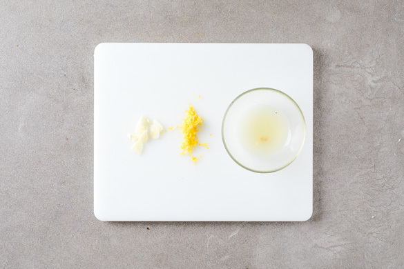 Den Knoblauch schälen und in feine Scheibchen schneiden. Die Zitronenschale abreiben, dann die Zitrone halbieren und auspressen.