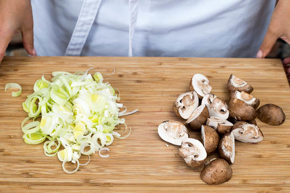 In einem großen Topf ausreichend leicht gesalzenes Wasser für die Tagliatelle zum Kochen bringen. Die Pilze ggf. mit Küchenkrepp oder einer Bürste säubern, die Stiele abschneiden und die Pilze und vierteln. Den Lauch der Länge nach halbieren, gründlich waschen und in feine Streifen schneiden.