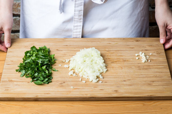 Den Backofen auf 220°C Ober-/Unterhitze vorheizen. Die Zwiebel schälen, halbieren und fein hacken. Den Knoblauch ebenso schälen und fein würfeln. Die Blätter des Basilikums grob hacken.