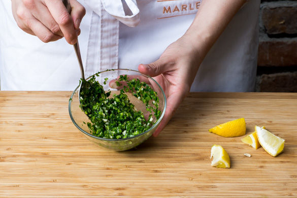 Inzwischen die Petersilie samt Stängel fein hacken. Die Schale der Zitrone abreiben, den Rest in Spalten schneiden. Die gehackte Petersilie mit restlichen Knoblauch, 2-3TL Zitronensaft, 1-2TL Zitronenabrieb sowie 2-3EL Olivenöl mischen und mit Salz und Pfeffer abschmecken.
