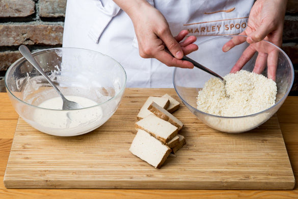 Die Tofuscheiben gleichmäßig im Mehlteig wenden, bis alles bedeckt ist und dann mit Sesam-Panko-Mischung panieren.