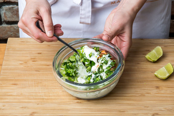 Zum Schluss die Lauchzwiebeln in feine Ringe schneiden und die Hälfte der Lauchzwiebeln mit Joghurt, Sriracha Sauce und Limettenabrieb mischen. Die restliche Limette in Spalten schneiden. Gemeinsam mit gebratenem Tofu, Dip, Ofengemüse und Kartoffeln und restlichen Lauchzwiebeln garniert servieren.