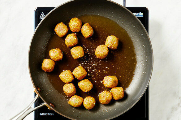 Die Falafeln in der Pfanne mit 2EL Olivenöl bei mittlerer Hitze auf jeder Seite 2–3Min. goldbraun anbraten.