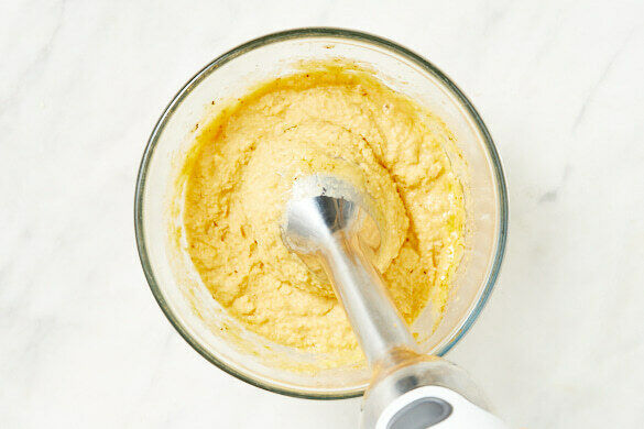 Die Kichererbsen in einem Sieb abtropfen lassen und mit dem Knoblauch, dem Tahini, dem Zitronenabrieb und -saft, 1TL Harissa, 3EL Olivenöl und 3EL Wasser in einem hohen Gefäß pürieren. Das Hummus mit Salz und Pfeffer abschmecken.