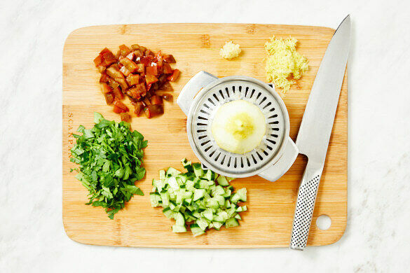Die Gurke in kleine Würfel schneiden. Die Tomaten ebenfalls in kleine Würfel schneiden. Den Knoblauch schälen und fein würfeln. Die Petersilie samt Stängeln fein hacken. Die Zitronenschale fein abreiben, dann die Zitrone halbieren und auspressen.