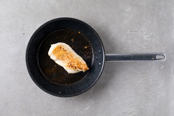 Das Fleisch trocken tupfen, mit 2EL Olivenöl einreiben und mit je 1 kräftigen Prise Salz und Pfeffer würzen. In einer großen Pfanne bei mittlerer Hitze auf beiden Seiten 2–3Min. goldbraun anbraten. Dann das Fleisch auf einem mit Backpapier ausgelegten Backblech im Ofen 10–12Min. backen, bis es auch in der Mitte durchgegart ist. Die Pfanne auswischen.